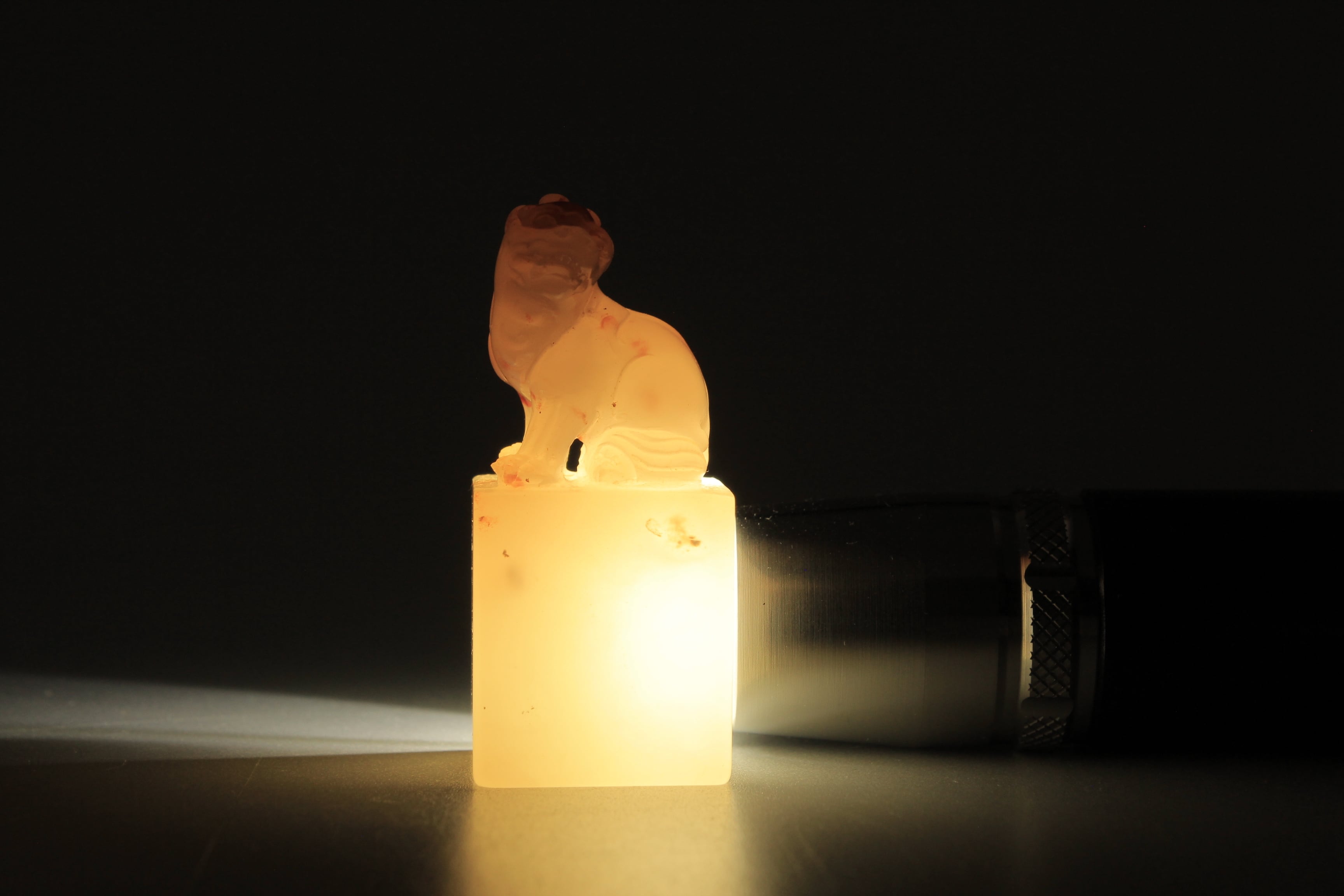 寿山水洞桃花石(すいどうとうかせき)です。透明な質感に赤い点が浮かんでおり、雪の中の桃花のように美しいです。全体的には氷のような透明感があります。印鈕には座っている古獣が彫られており、生き生きとして可愛らしいです。印面は2.5センチ、姓名印や雅号印に適しています。